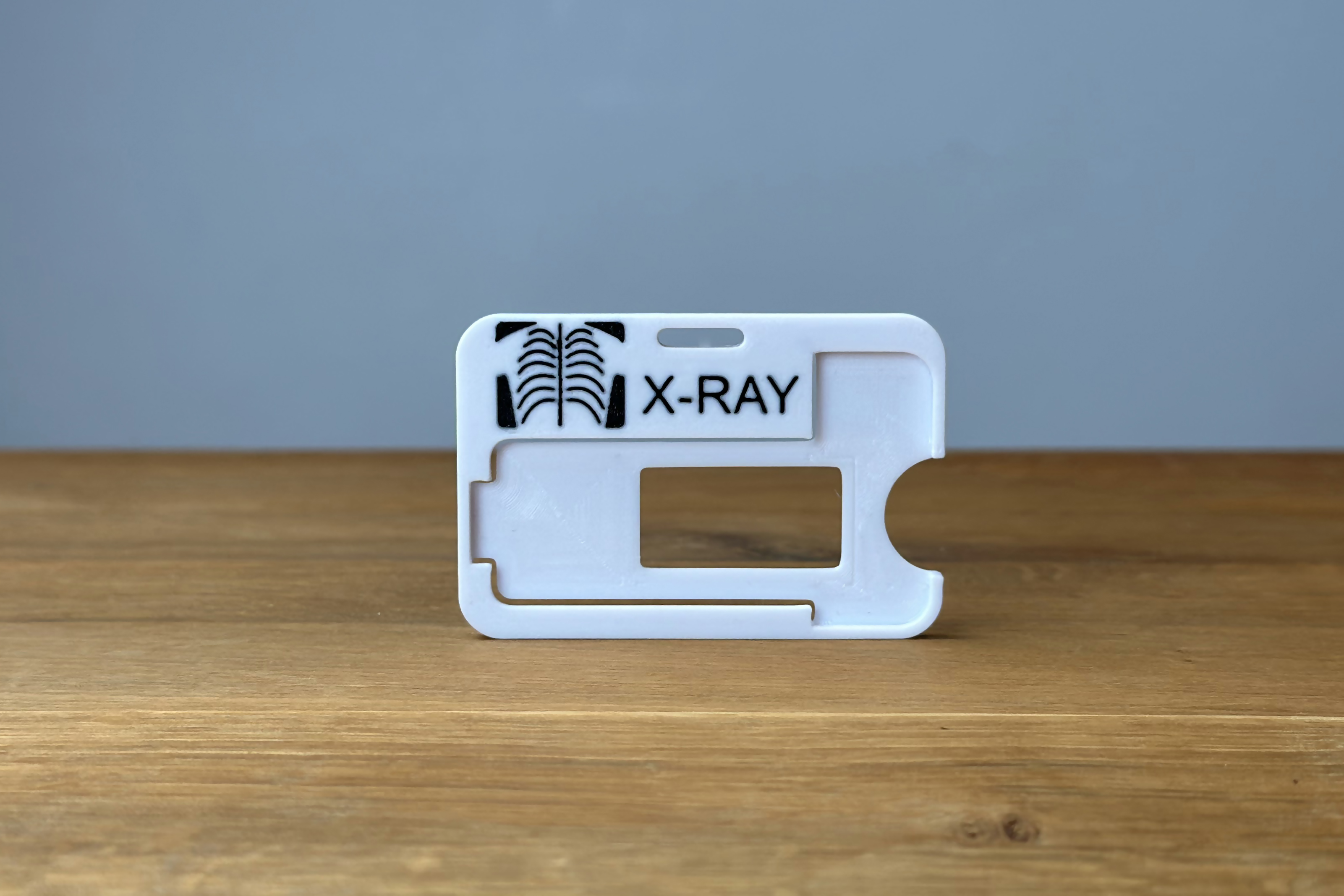 Your personal carrier frame as a symbol and the text "Röntgen" or "X-RAY" in various colours.Our personal dosimeter carrier frame not only offers comfort and safety in radiation dose monitoring, but also the opportunity to show style. We understand that personal style and preference matter, and that's why we offer a wide range of colour combinations to choose from.The dimensions are:Length: 76.66mmWidth: 51.40mmHeight: 4.5mmColours may vary slightly depending on batch and supplier.The surface has a structure typical for 3D printing.